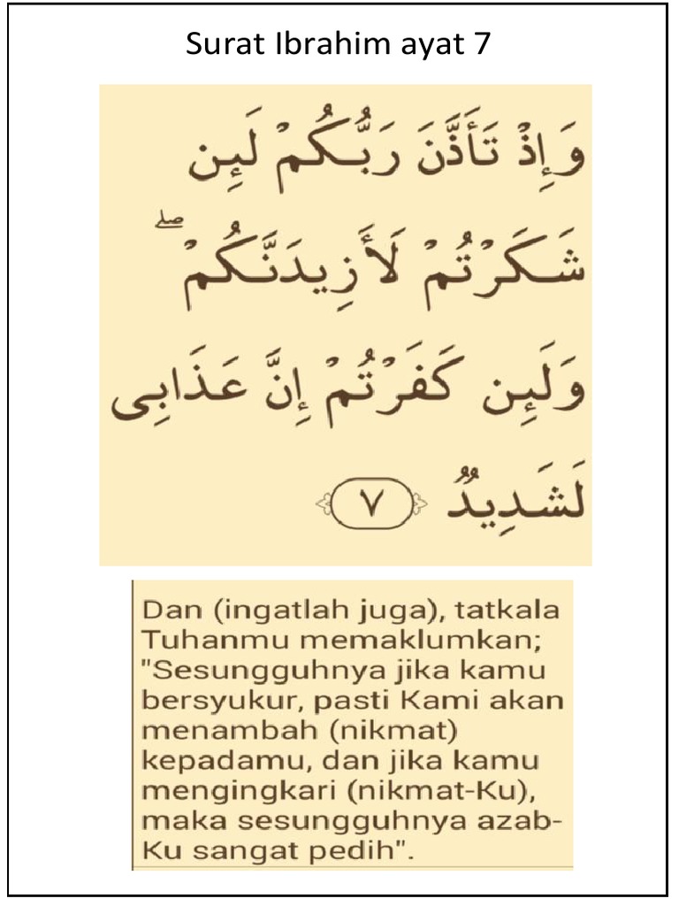 Surah ibrahim ayat 7 with english translation. Musa berkata kepada mereka, dan ingatlah ketika tuhan kalian memberitahukan dengan pemberitahuan yang tegas, 'jika kalian beryukur kepadanya. وإذ تأذن ربكم لئن شكرتم لأزيدنكم ولئن كفرتم إن عذابي لشديد. Berisi makna tentang bersyukur ayat tentang bersyukur terjemah arti: Quran surat ibrahim ayat 7.